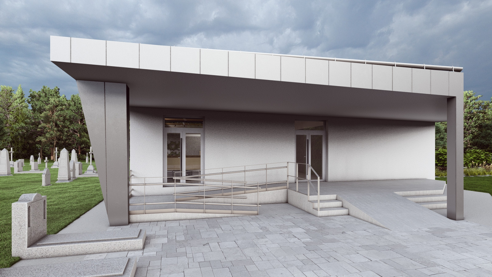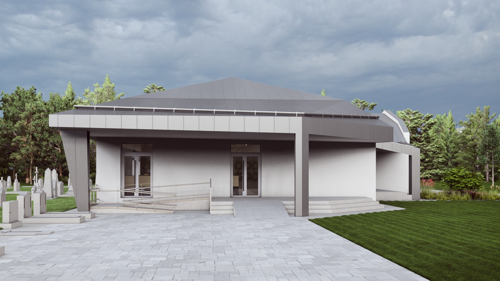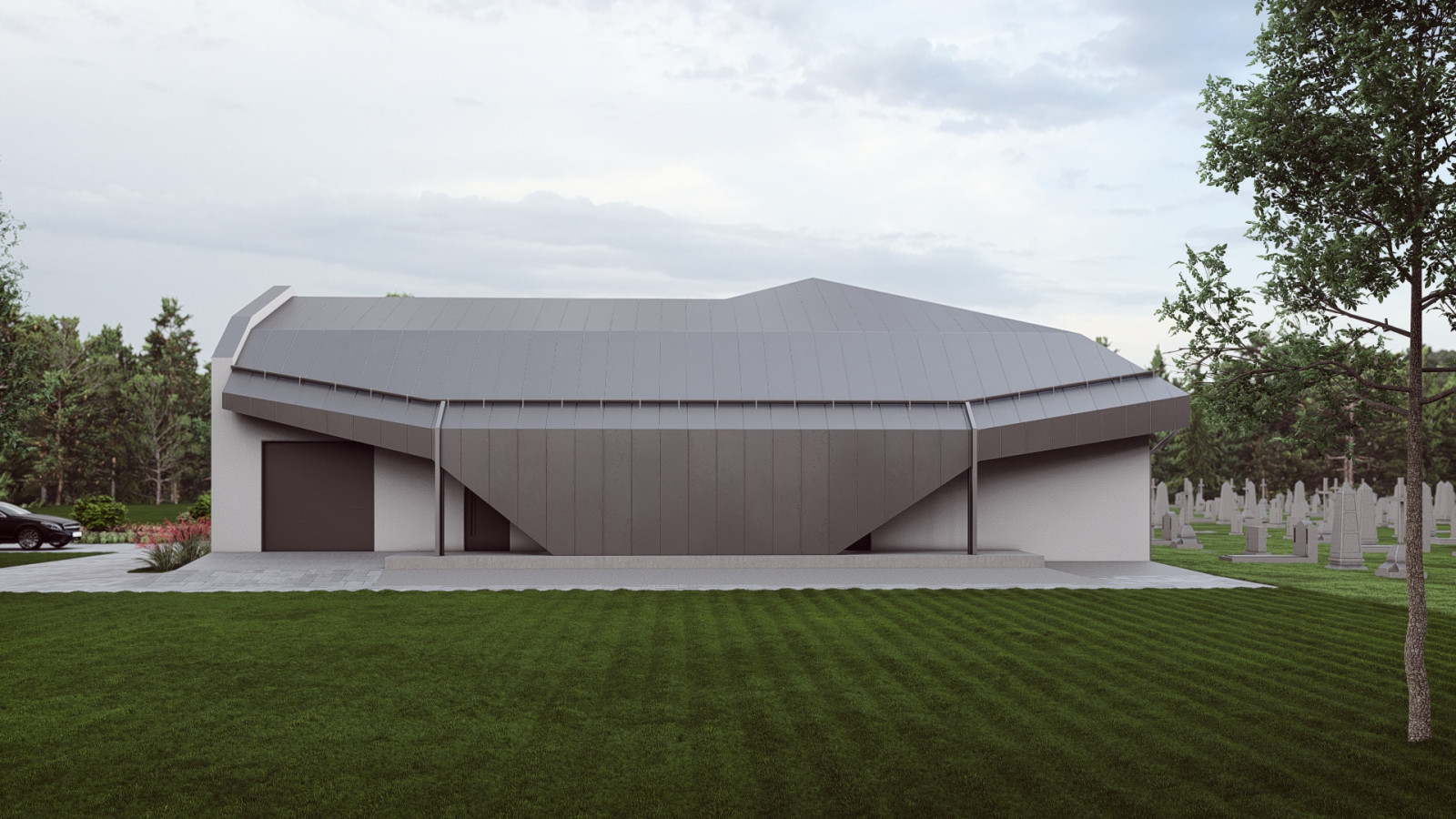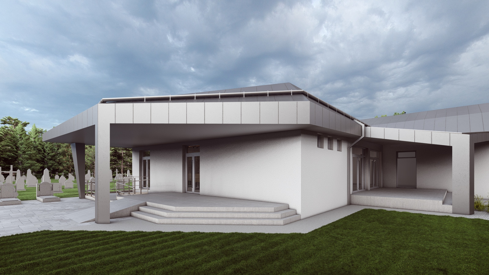 Architektúra a hmotové riešenie domu smútku v Malčiciach ostáva v pomerne z veľkej časti zachované, zmena nastáva pri navrhovanom tvare prestrešenia hlavného vstupu a nového prestrešenia východu z domu smútku. Strechu navrhujeme dynamicky rozohrať pomocou rôznych výšok na hranách obvodu strechy, vďaka čomu tak meníme výraz starej manzardovej strechy na moderný dominantný architektonicky prvok.