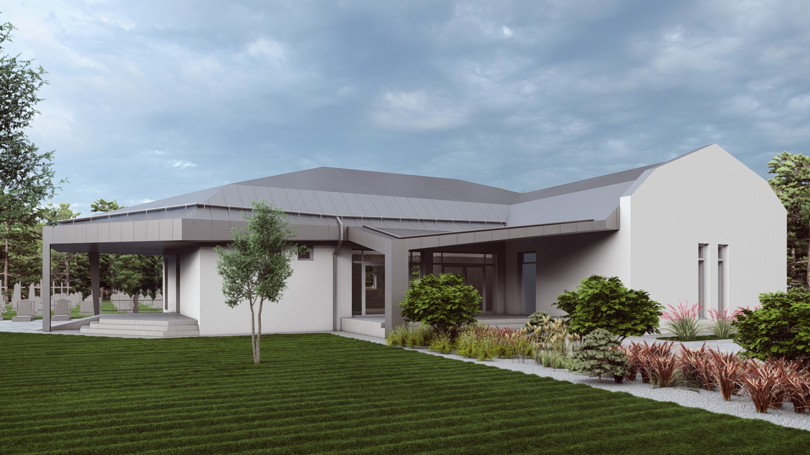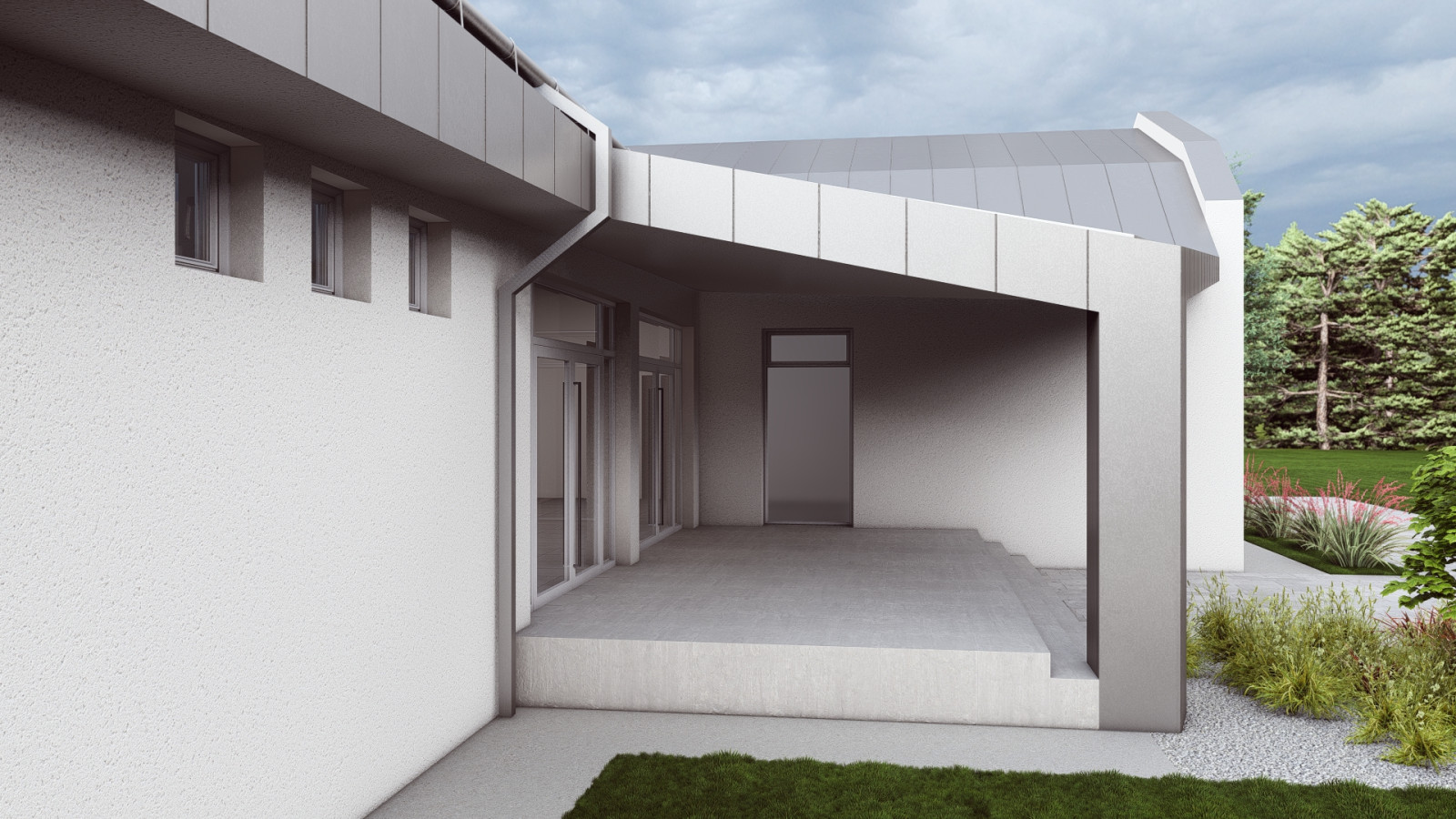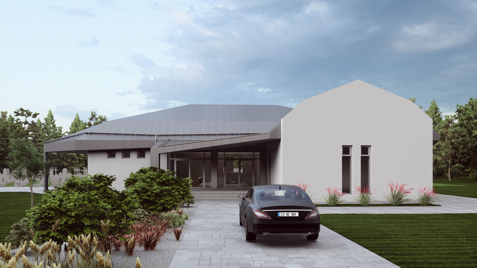 Architektúra a hmotové riešenie domu smútku v Malčiciach ostáva v pomerne z veľkej časti zachované, zmena nastáva pri navrhovanom tvare prestrešenia hlavného vstupu a nového prestrešenia východu z domu smútku. Strechu navrhujeme dynamicky rozohrať pomocou rôznych výšok na hranách obvodu strechy, vďaka čomu tak meníme výraz starej manzardovej strechy na moderný dominantný architektonicky prvok.