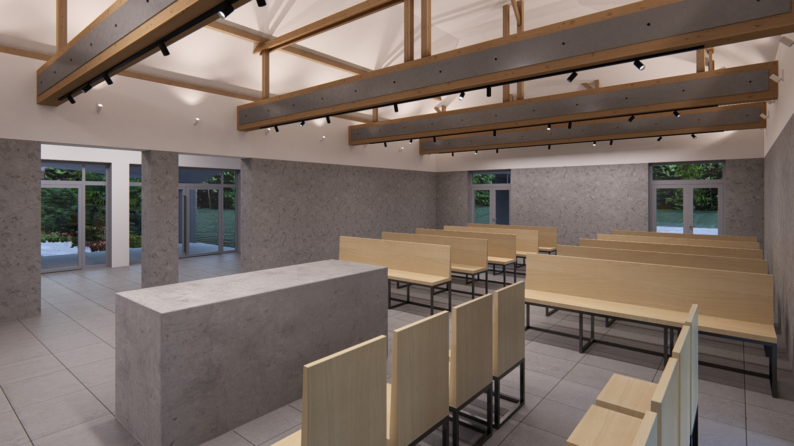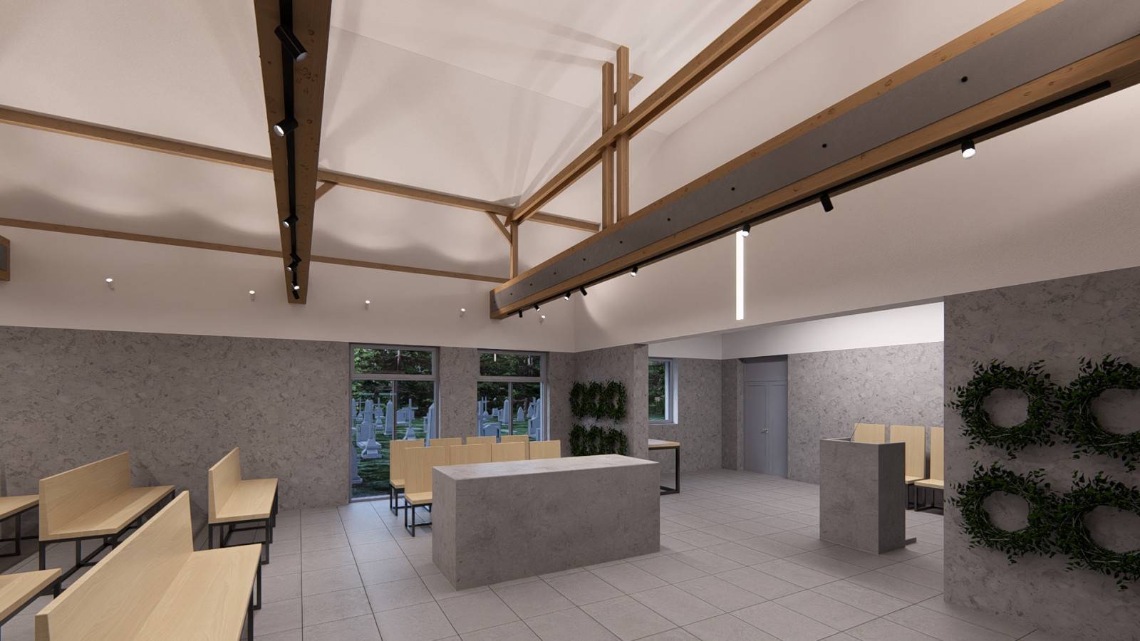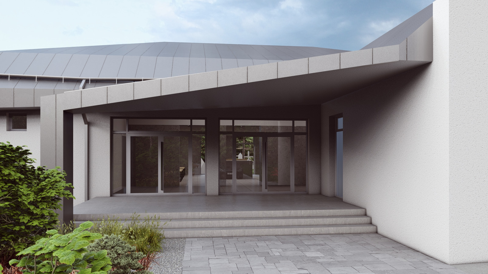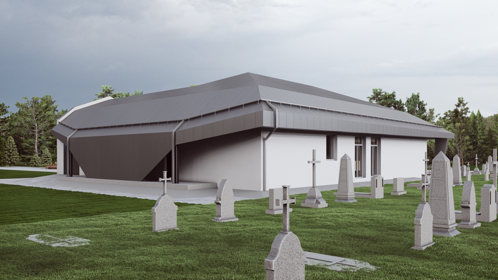 Architektúra a hmotové riešenie domu smútku v Malčiciach ostáva v pomerne z veľkej časti zachované, zmena nastáva pri navrhovanom tvare prestrešenia hlavného vstupu a nového prestrešenia východu z domu smútku. Strechu navrhujeme dynamicky rozohrať pomocou rôznych výšok na hranách obvodu strechy, vďaka čomu tak meníme výraz starej manzardovej strechy na moderný dominantný architektonicky prvok.