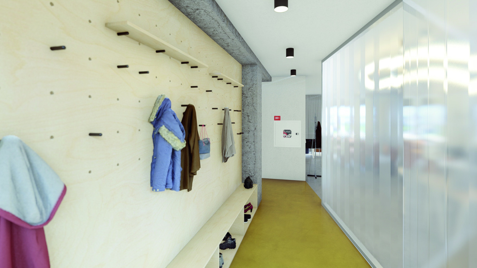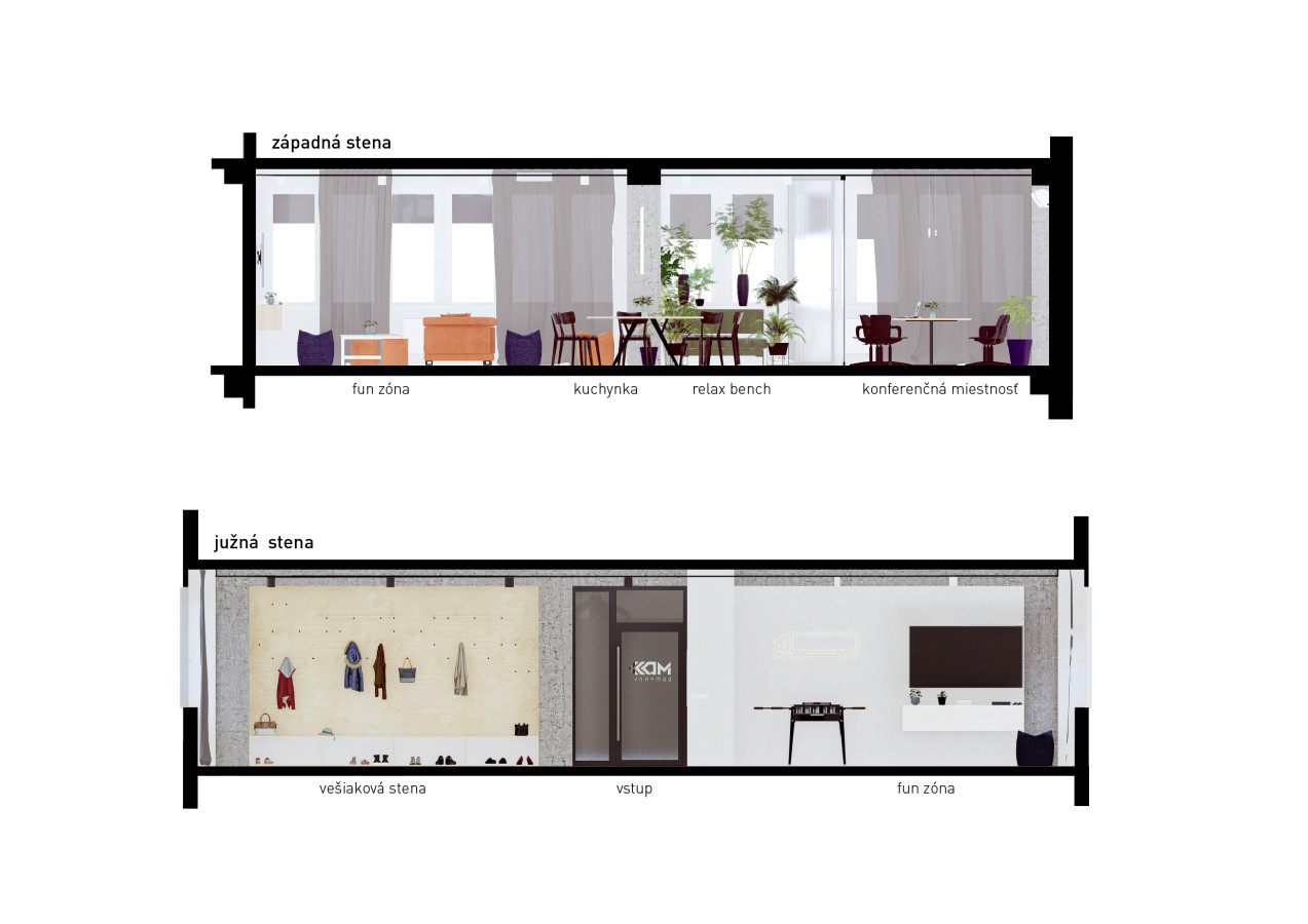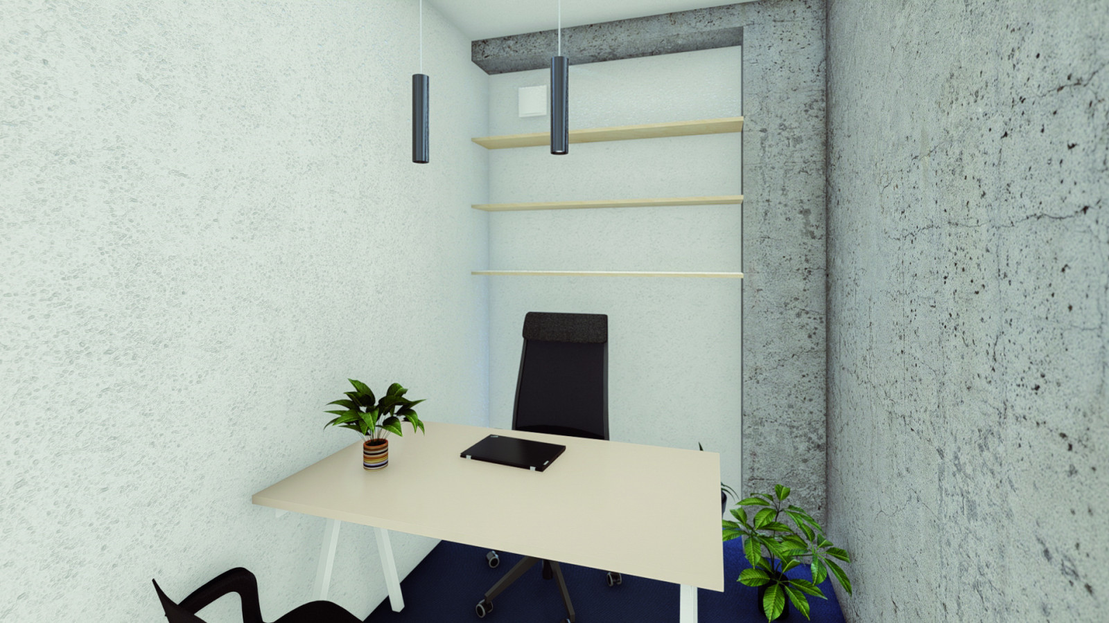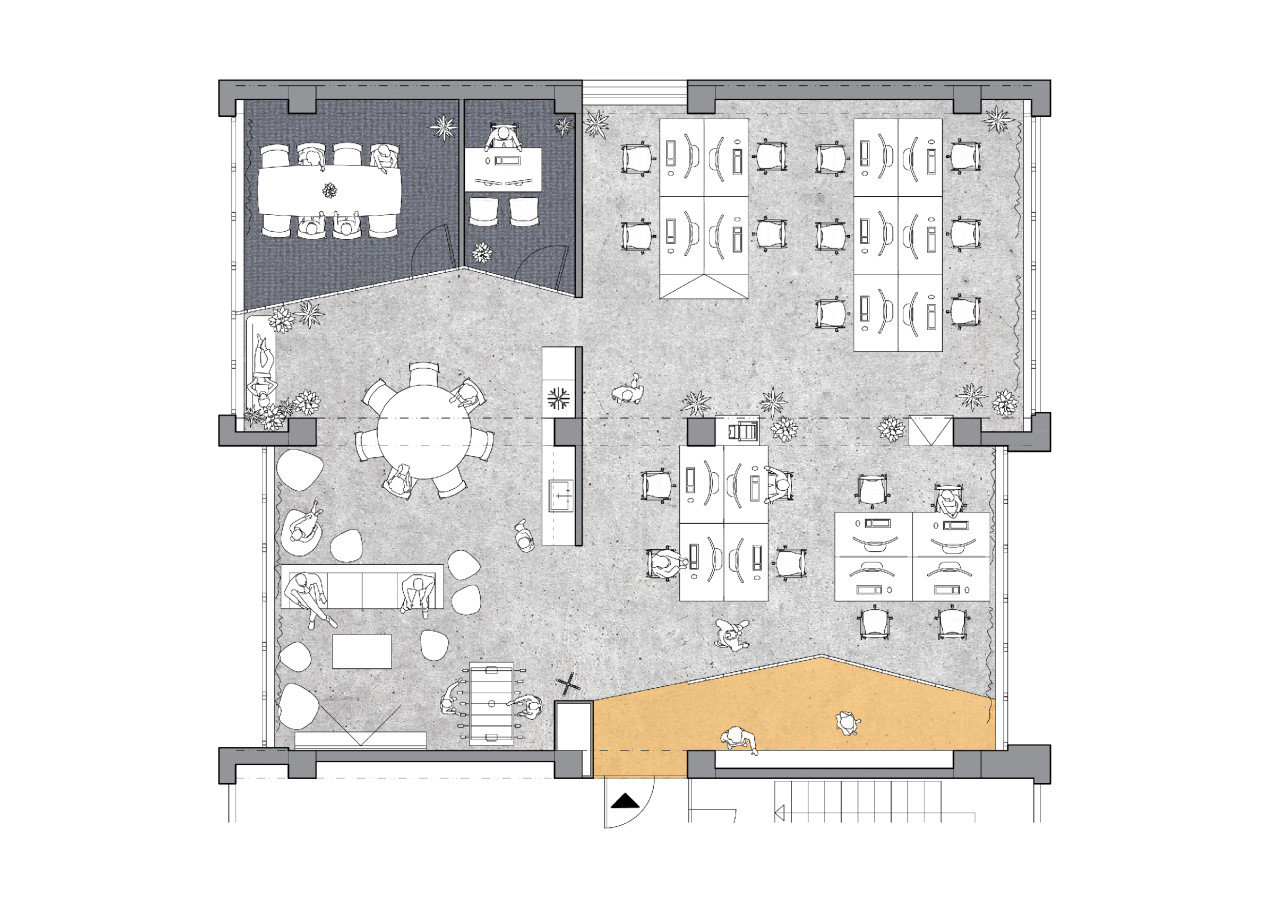 Návrh interiéru vychádza z konceptu priznania surových materiálov. Základná kostra dizajnu interiéru spočíva v očistení konštrukčného systému až na hrubý betón. Pre tvorbu dispozície interiéru bol použitý spôsob tzv. „ open space office“.