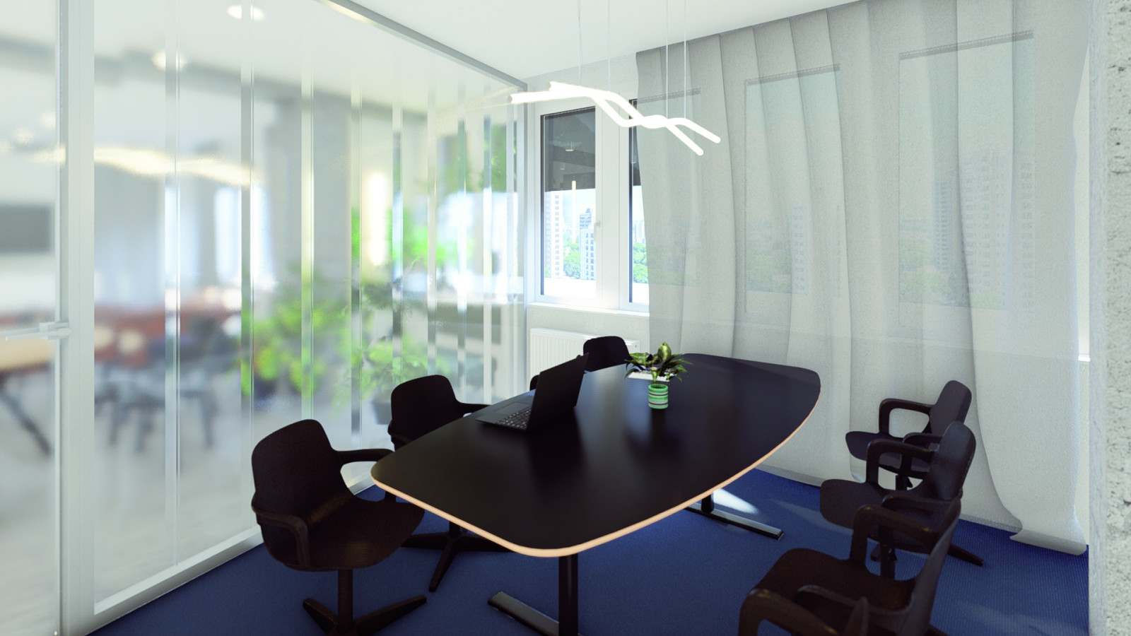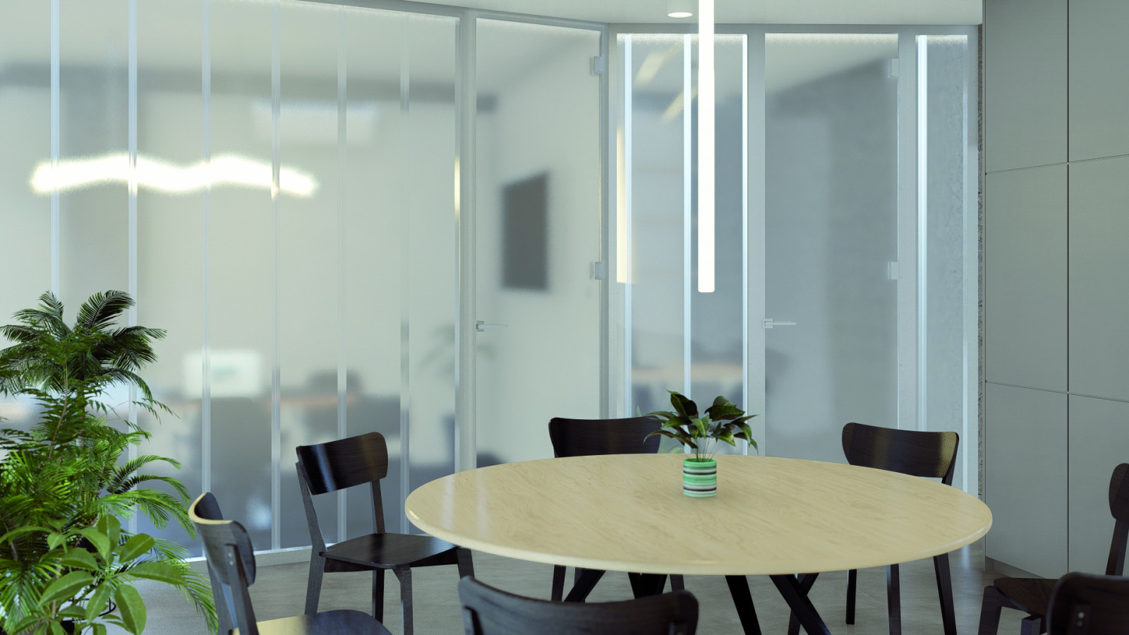 Priestor kancelárie spĺňa moderné trendy a je racionálne rozdelený na pracovnú a oddychovú časť. Pri vstupe bolo nevyhnuté vytvoriť oddelený priestor od otvoreného kancelárskeho priestoru, aby sme vytvorili šatníkovú časť. Na oddelenie sme použili sklá z Profilitu. Tento materiál sme použili aj na oddelenie zasadacej miestnosti a kancelárie manažéra. Zalomenie sklenených stien bolo inšpirované logom firmy.