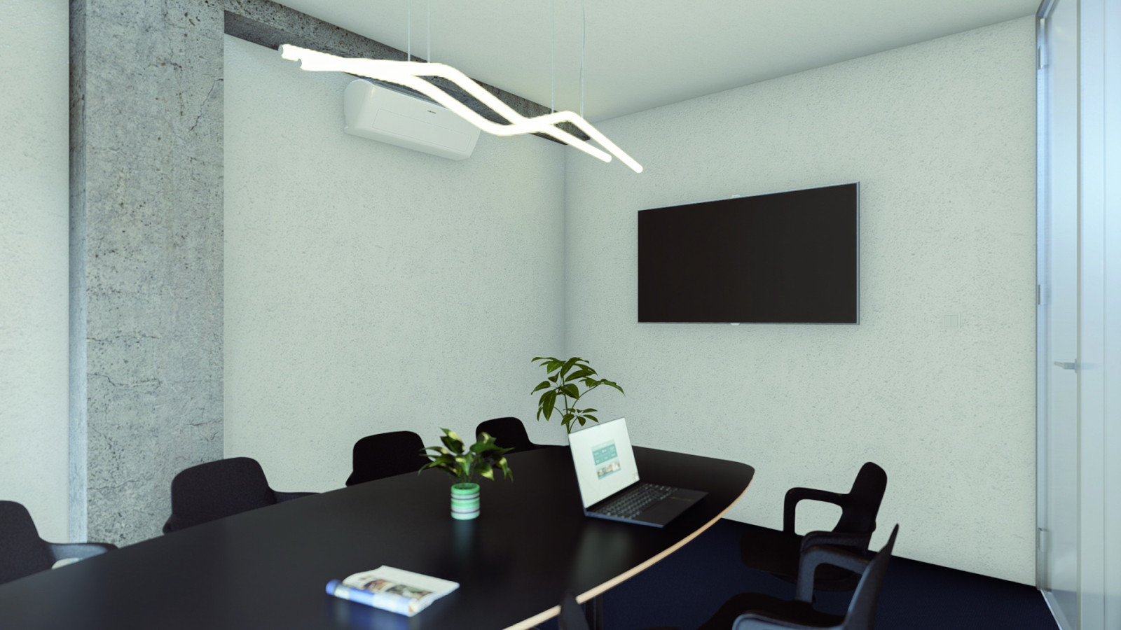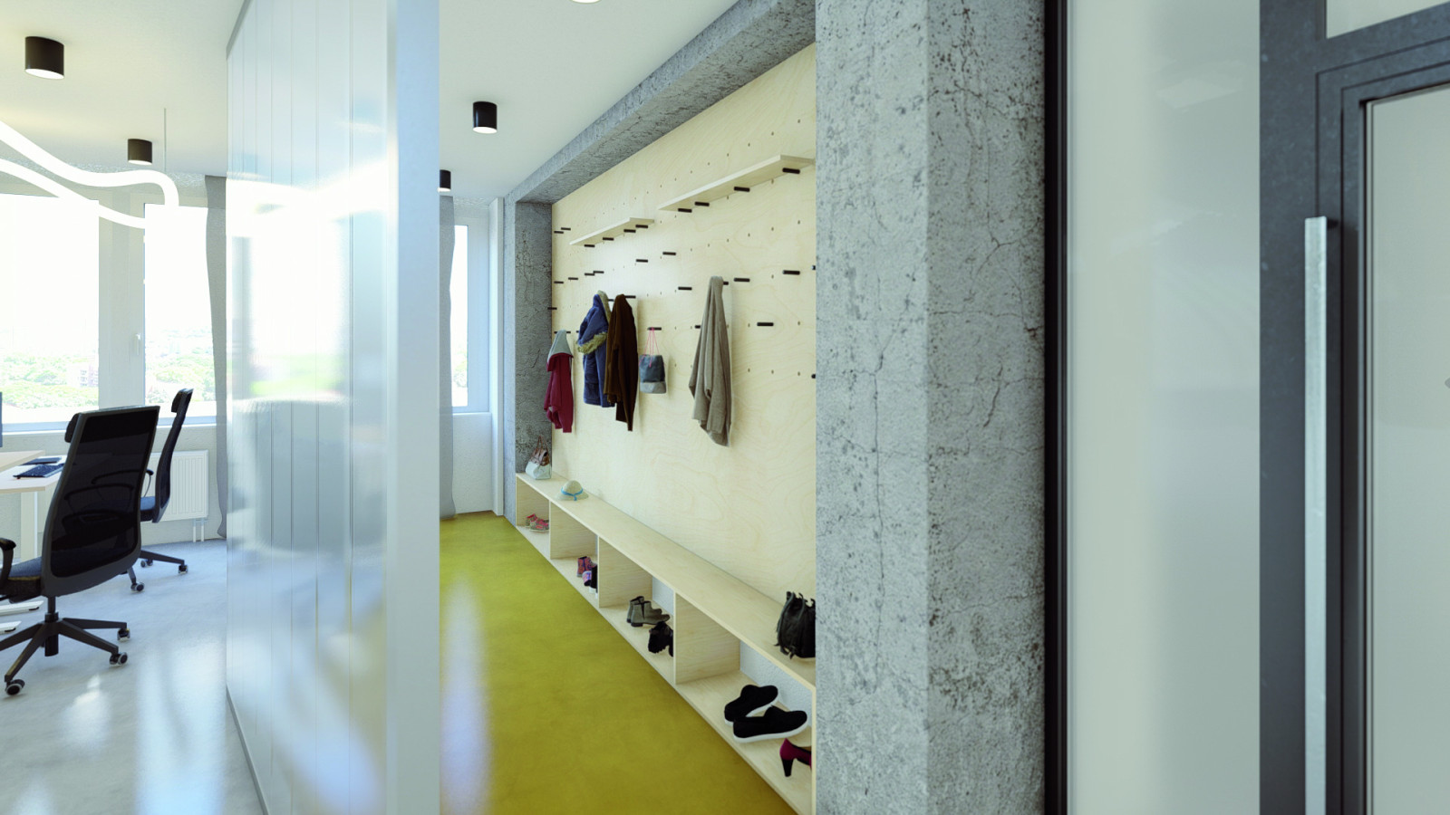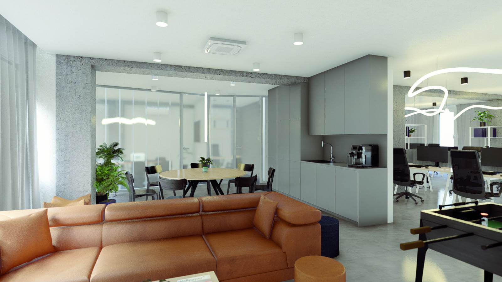 Surový monochromatický interiér je oživený farebnosťou nábytku a podláh pri vstupe a zadnej konferenčnej časti. Použité farby vychádzajú taktiež z farieb loga firmy. Hlavným akcentom na strope je lineárne trubicové svietidlo nad celým pracovným priestorom. Svetelné trubice v rôznych formách sú použité aj v konferenčnej miestnosti, pri relaxačnej lavici a nad jedálenským stolom.