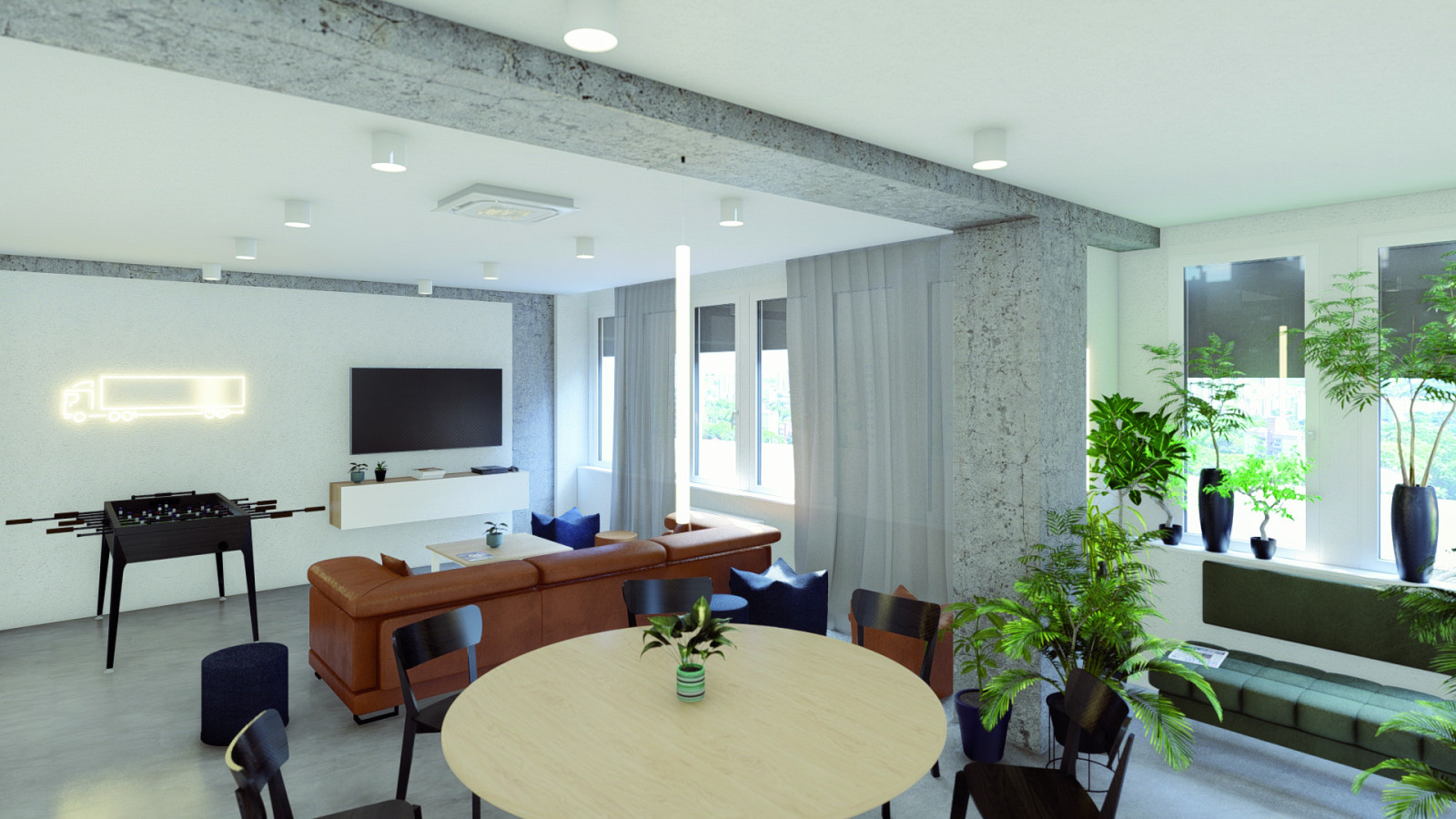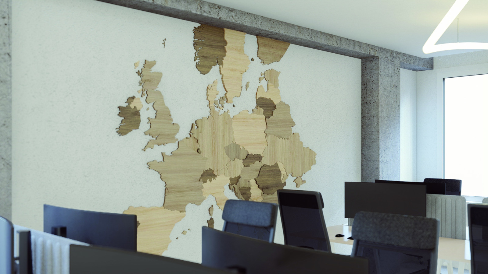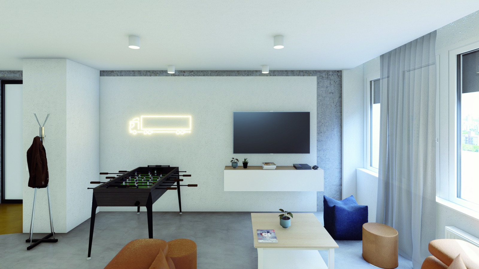Na zadnej stene v pracovnej časti navrhujeme drevenú mapu Európy a v kancelárii manažéra sme navrhli neónové svietidlo v tvare kamiónu, ako odkaz na zameranie firmy.