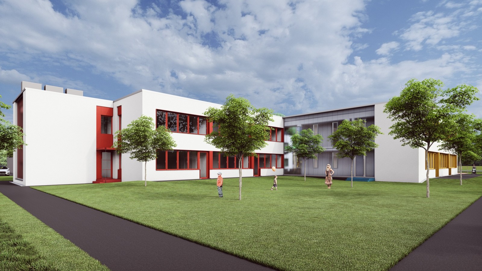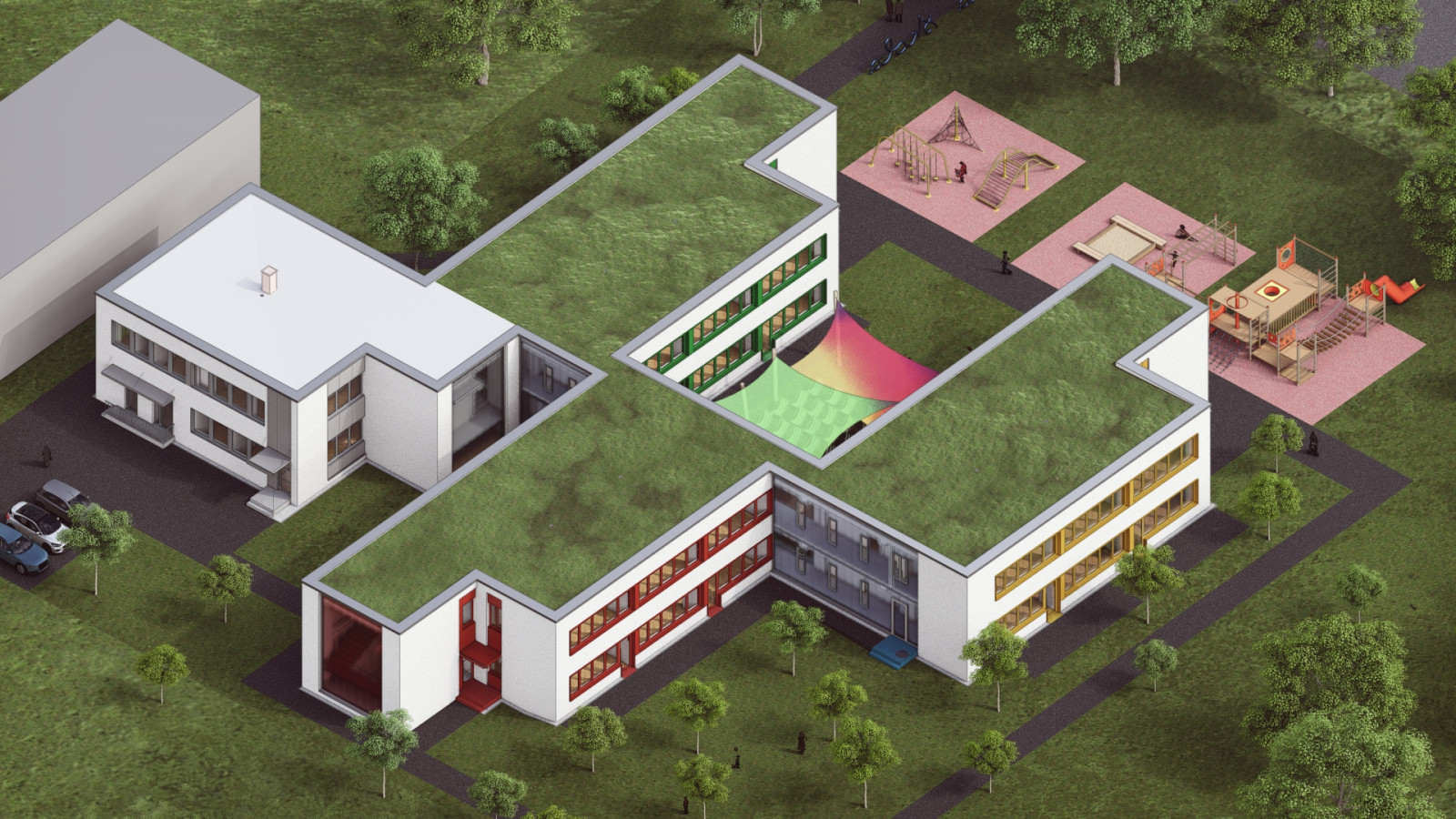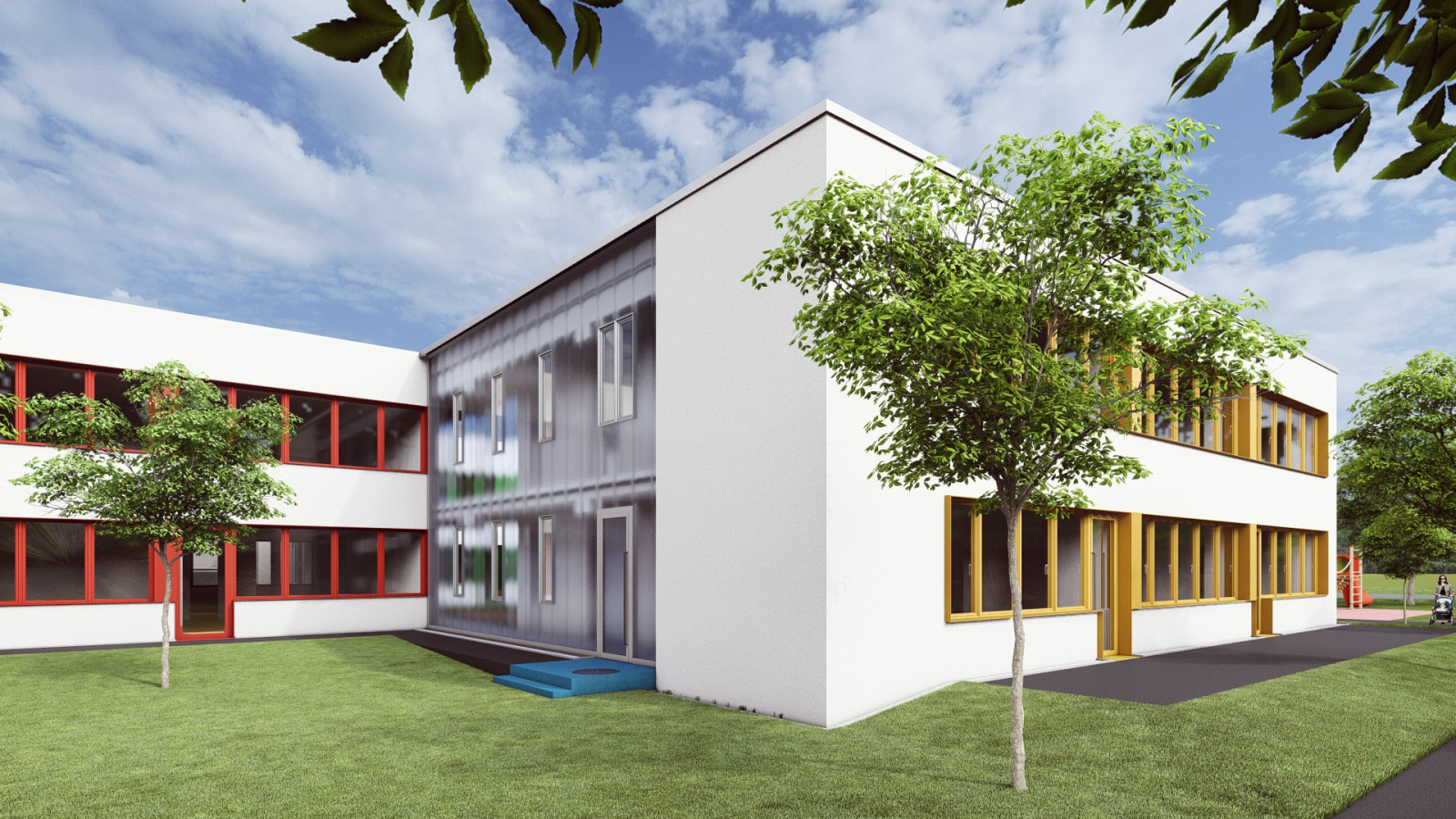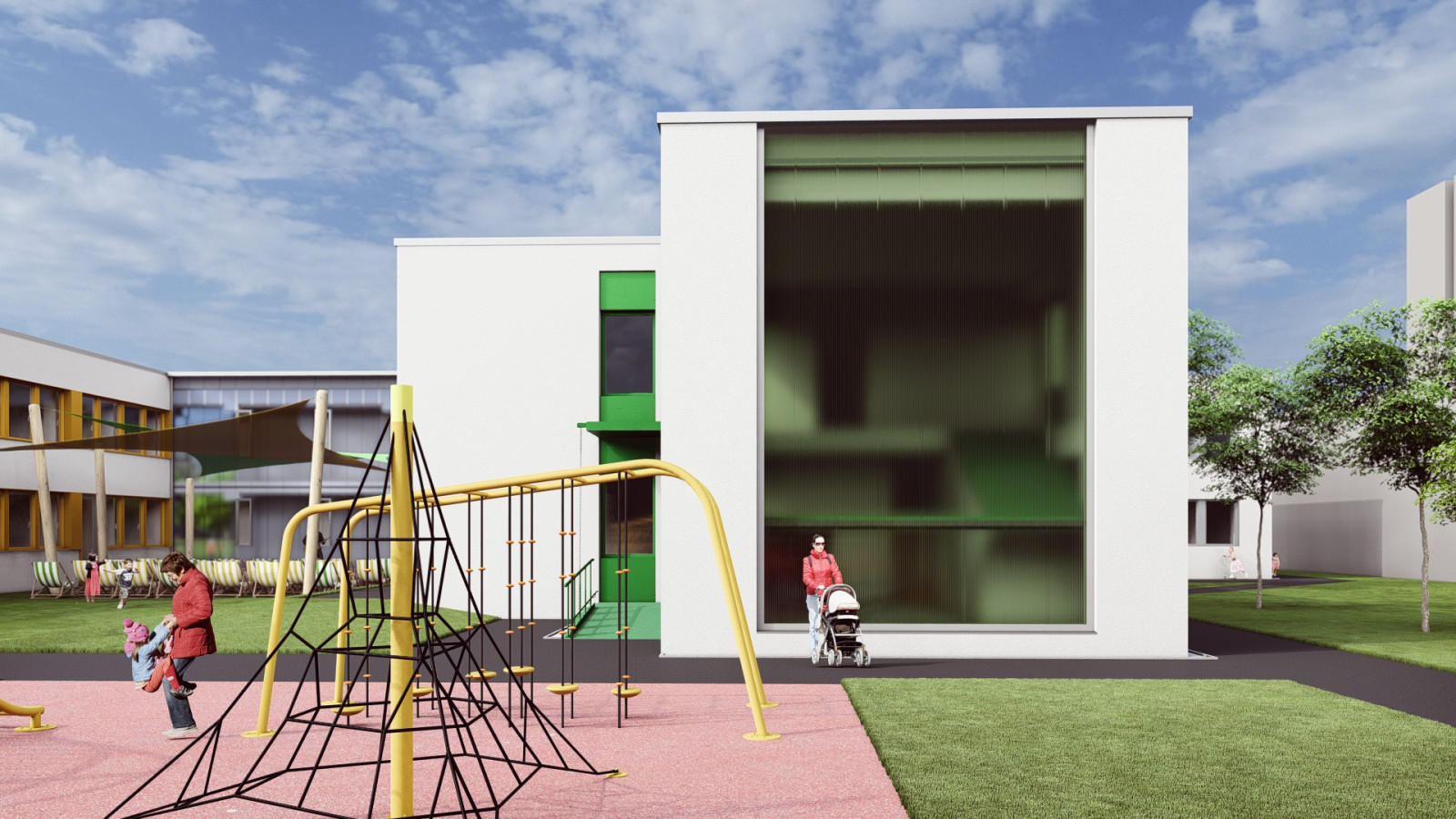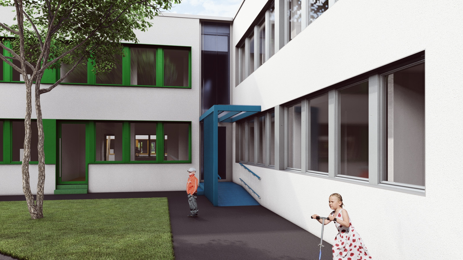 Pavilón „A“ si zachováva svoje dva samostatné vstupy zo severozápadnej strany – pre zamestnancov a pre zásobovanie – a každý z pavilónov s triedami disponuje vlastnou dvojicou vstupov pre rodičov s deťmi.