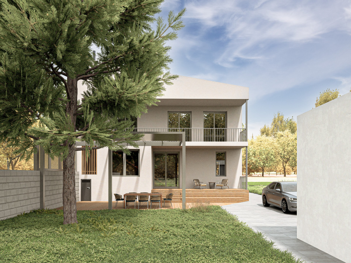 V zadnej časti prízemia sa nachádza toaleta a rodičovská spálňa so samostatnou kúpeľňou. Denná časť je priamo prepojená s exteriérom – výstupom na prestrešenú terasu, ktorá slúži ako prirodzené rozšírenie obytného priestoru.