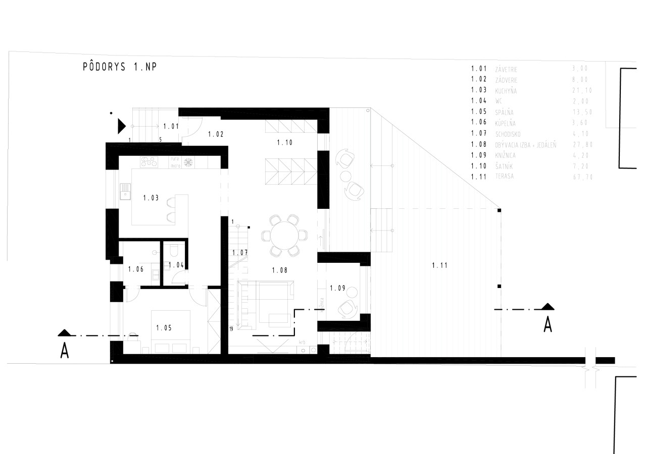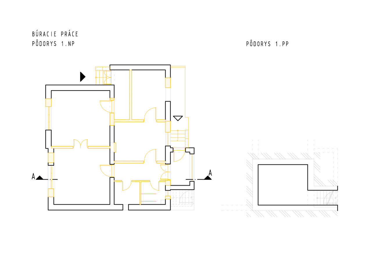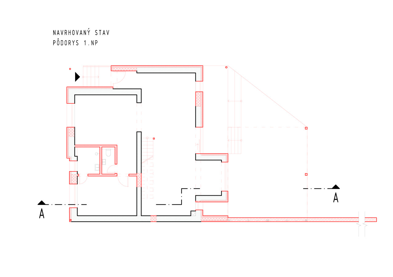 Na 1.NP sme navrhli dispozičné úpravy existujúceho objektu, ktoré reflektujú potreby a životný štýl investora. Nový vstup do domu je situovaný na východnej fasáde – ide o obnovenie pôvodného, dnes už nevyužívaného vstupu. Po vstupe sa priestor prirodzene otvára do dennej zóny, ktorú tvorí kuchyňa, obývacia izba a knižnica, vzájomne prepojené do harmonického celku. Praktický vstupný prvok v podobe integrovanej skrine nahrádza tradičný šatník či botník, čím šetrí priestor a zvyšuje jeho využiteľnosť.