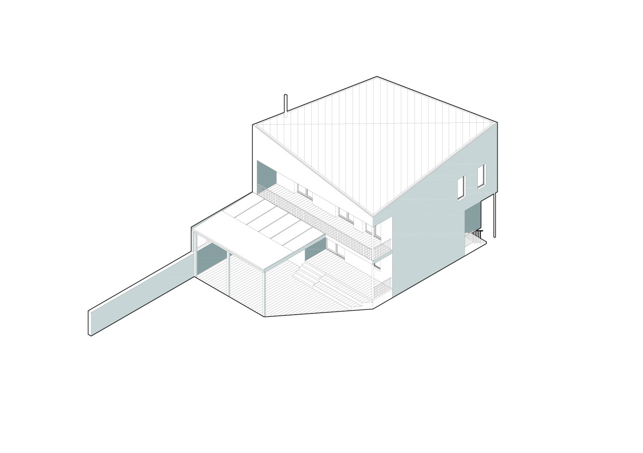 Architektonický výraz domu definuje originálne riešenie strechy – šikmá rovina s diagonálnym hrebeňom, ktorý prechádza od juhovýchodného k severozápadnému rohu domu. Táto forma vytvára dojem pultovej strechy z každého pohľadu, čím domu dodáva dynamiku a súčasný charakter. Nezvyčajná geometria strechy sa stáva kľúčovým prvkom architektonickej identity a zreteľne odkazuje na moderný prístup k rekonštrukcii tradičného rodinného domu.
